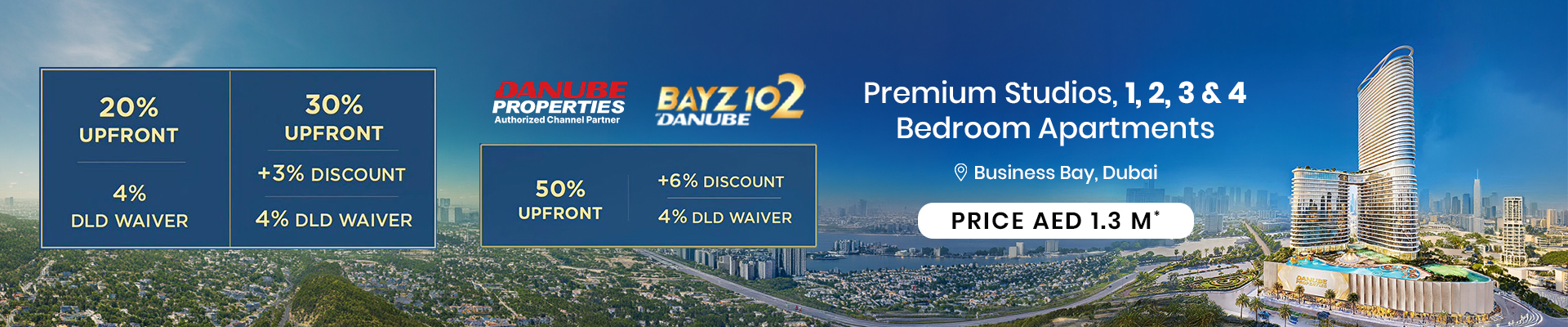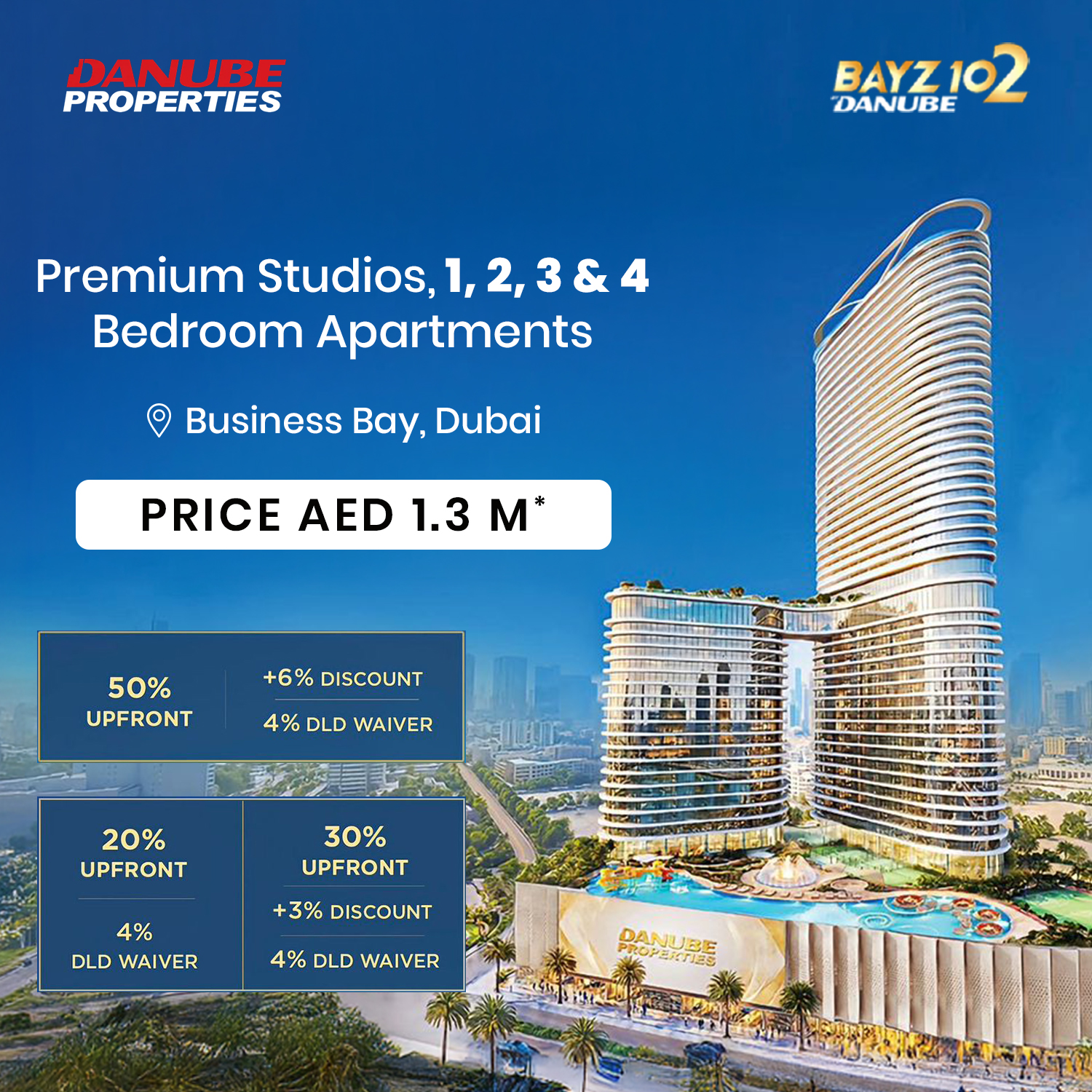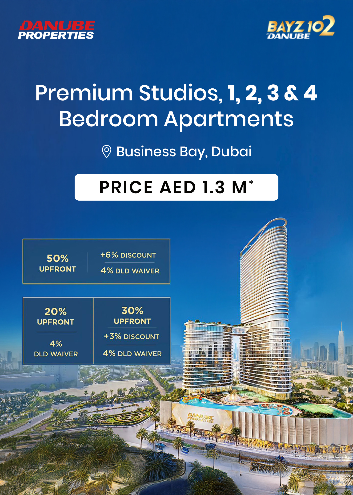 Danube Bayz 102 at Business Bay is the new rise of residential development by the renowned Danube Properties, lined with premium studios, 1, 2, 3 and 4-bedroom apartments and presidential suites in Dubai. The stunning façade is a high-rise tower with panoramic views of the Iconic landmarks like Burj Khalifa and the Dubai Canal. Indulge in the sophisticated lifestyle with interiors that purely blend elegance and modernity, promising a sanctuary of distinction, where every detail is designed to elevate your living experience to new heights. The strategic location ensures that residents are only a two-minute walk from the Business Bay Metro Station, allowing for easy access to the rest of the city. Sheikh Zayed Road, one of Dubai’s key arteries is also in close proximity, connecting residents to major hubs such as Dubai Marina, Jumeirah, and Palm Jumeirah.